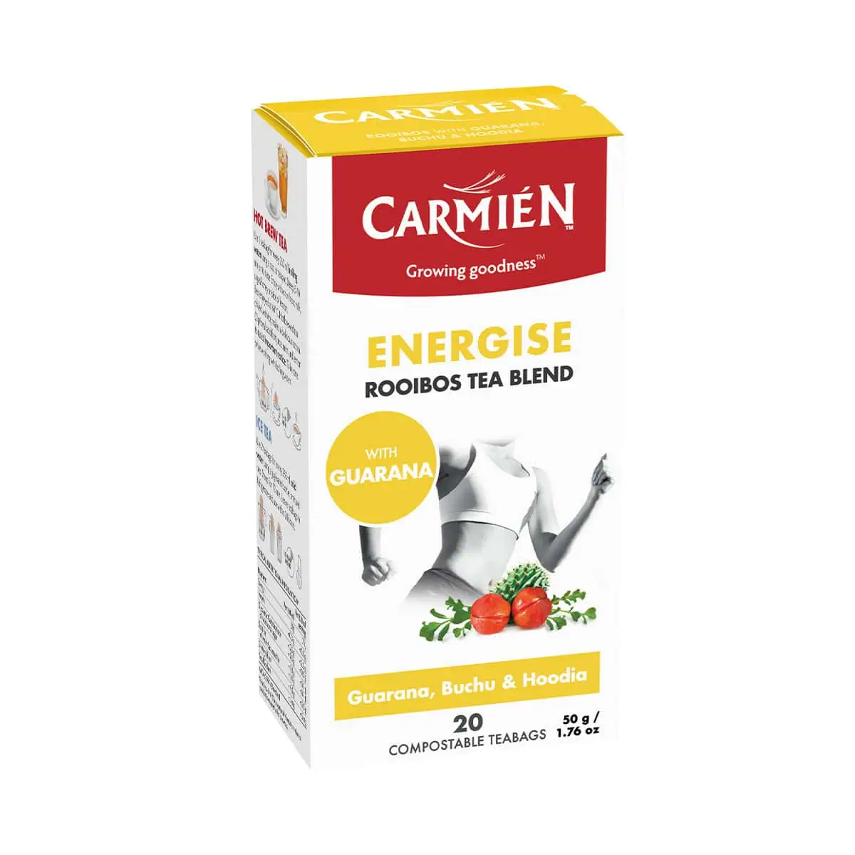 CarmiĆØn Energise is a perfect blend of Guarana, Hoodia, Buchu, Rooibos, and Forest Berries. Enjoy this tea in the morning for a natural shot of goodness. Guarana (contains caffeine) is known to assist metabolism and reduce mental and physical fatigue. Buchu relieves water retention, and Hoodia helps suppress appetite.